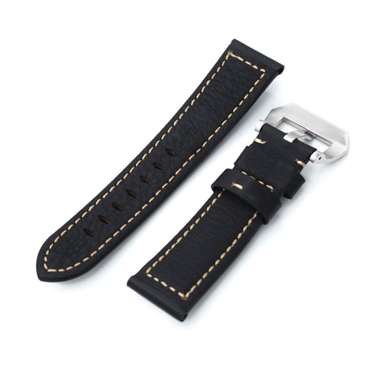 22mm or 24mm Black Smooth Leather Tapered Strap, Brushed