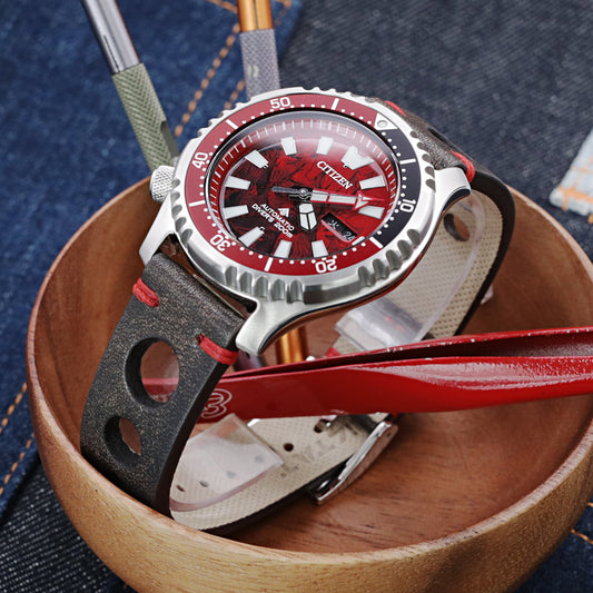 Q.R. 20mm Blackish Brown Leather Italian Handmade Racer strap, Red St.
