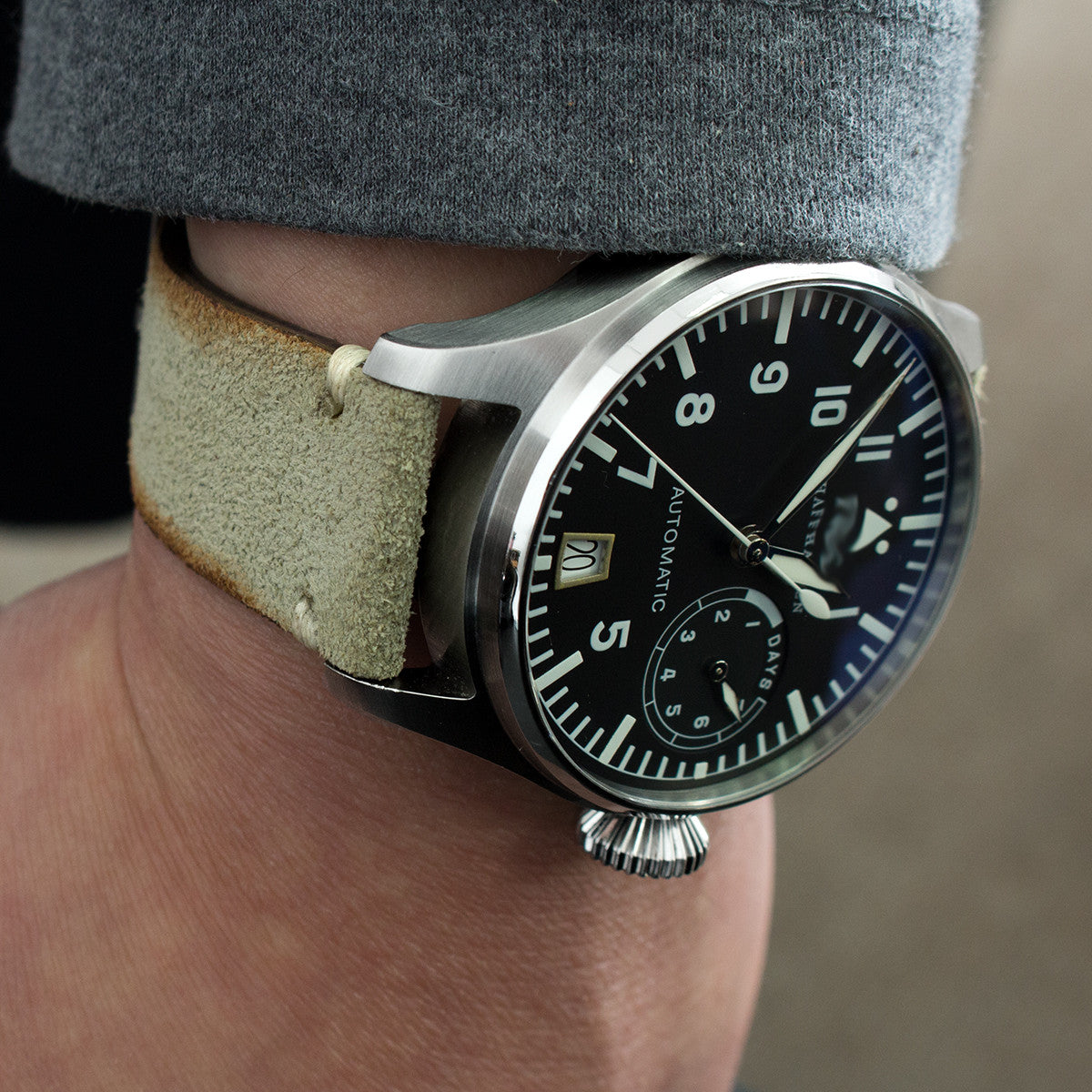 This Italian nubuck leather watch band have rubbed surface, giving out a touch similar to suede but more strong. Vintage mood strongly enhanced by gradually diffused smoky effect, created by free hand painted black edge lacquer sealant. Featured in cut strap with stitching at lug end and tip of strap. This fine leather is soft but durable, also added a level of comfort to your wrist. Certainly, this is one of the best replacement straps that work well with your RX or IWC.