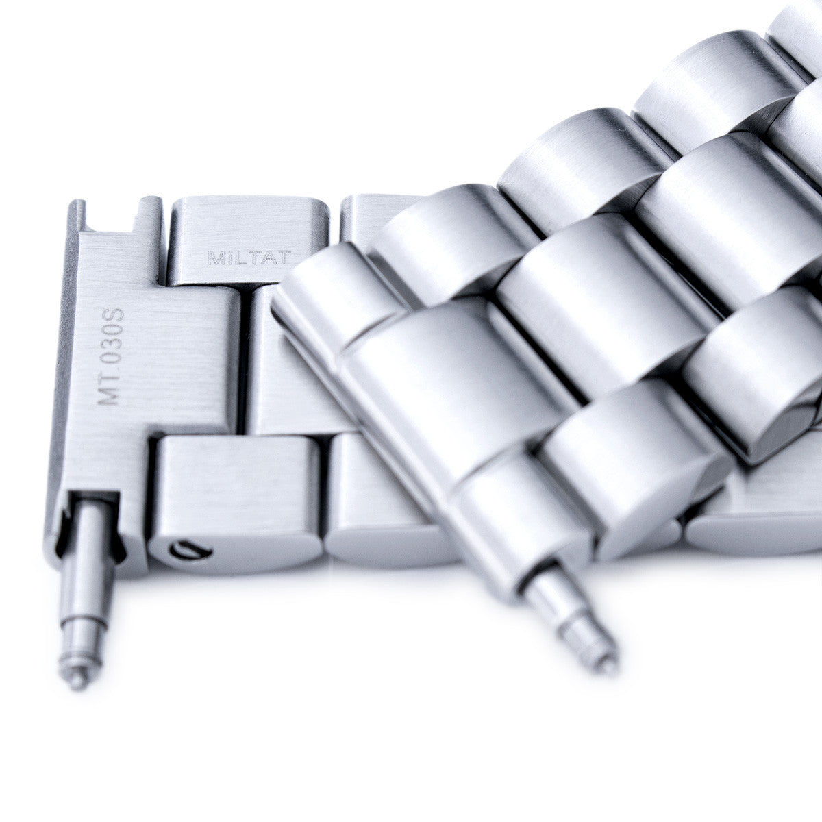 Endmill brushed solid 316L stainless steel watch bracelet is design for 20mm lug diver or sport watch case. Generic 2.5mm diameter Fat stainless steel spring bars included. All soild links including end links in half-moon shape are structured by screw fix adjustable details instead of common pins. An awesome replacement watch bracelet tailor made for 20mm lug luxury watches.
