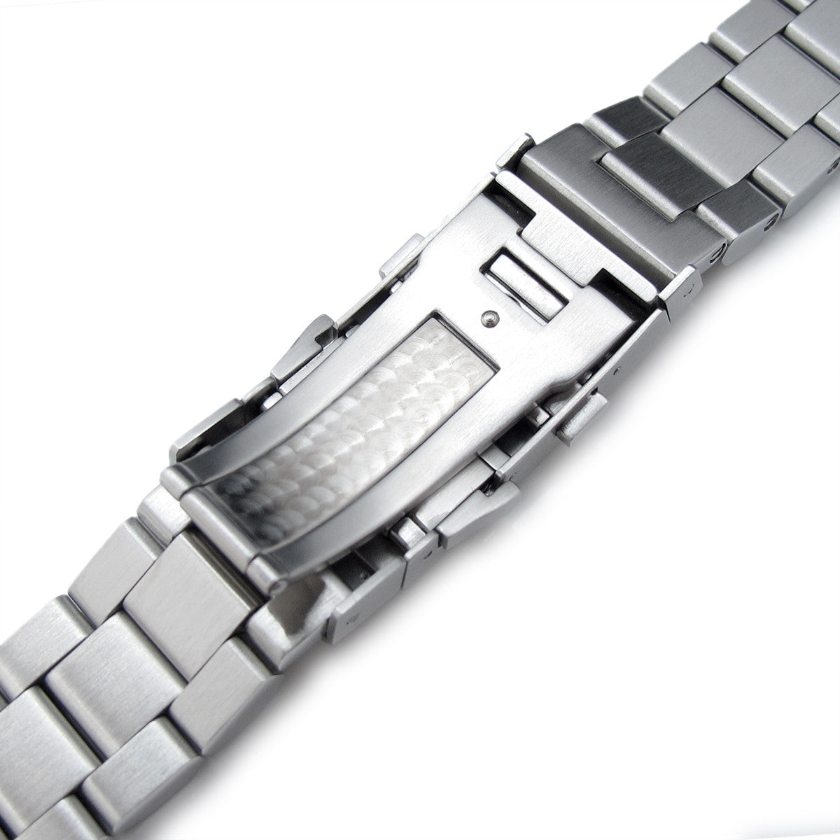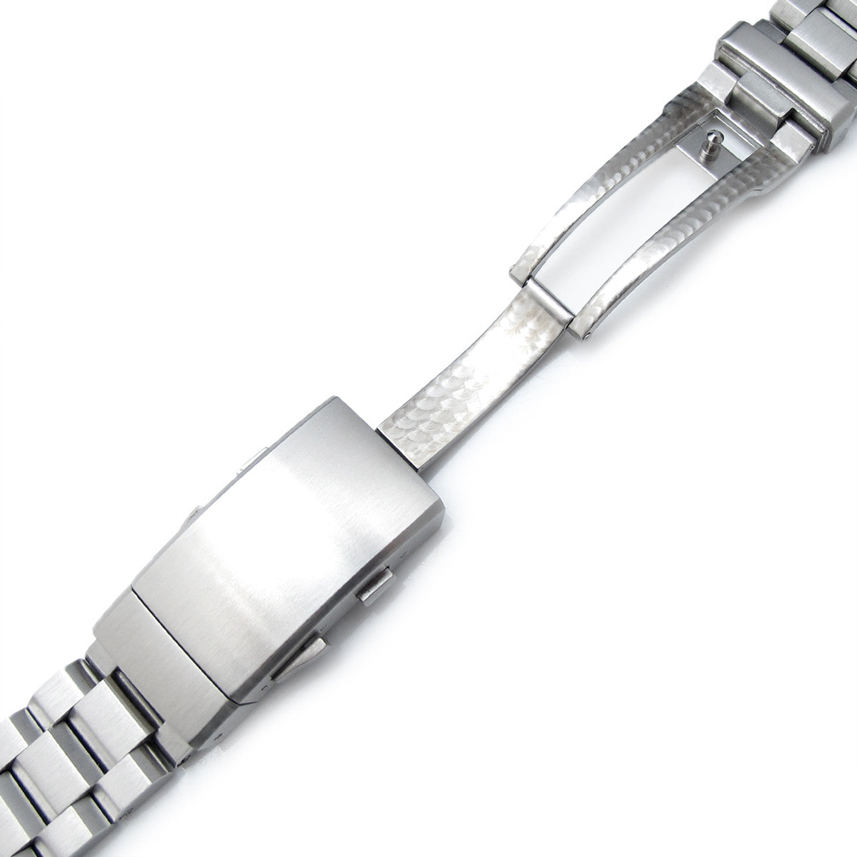 Hexad watch bracelet is a striking new design in 2016. Each link is composed of 3 Chamfer edge solid 316L stainless steel units. Hexad is a contemporary version of the traditional O Boyer bracelet, but more thick & sturdy over 100 grams. Considering the comfort and sustainability, it bends smoothly following your wrist. Well-made solid 316L stainless steel links are assembled with screws instead of flimsy pins to keep its solidity and stability. Item also included one pair of FAT spring bar (eg. Generic SEI DIA. 2.5mm spring bars) to ensure the watch band is connected securely with your watch. Accompanied with Ratchet Buckle Clasp is an ideal Wetsuit watch band buckle. The ratchet theory extension mechanism is of great importance for both convenience and safety. Another awesome aftermarket stainless steel watch bracelet for luxury watches.