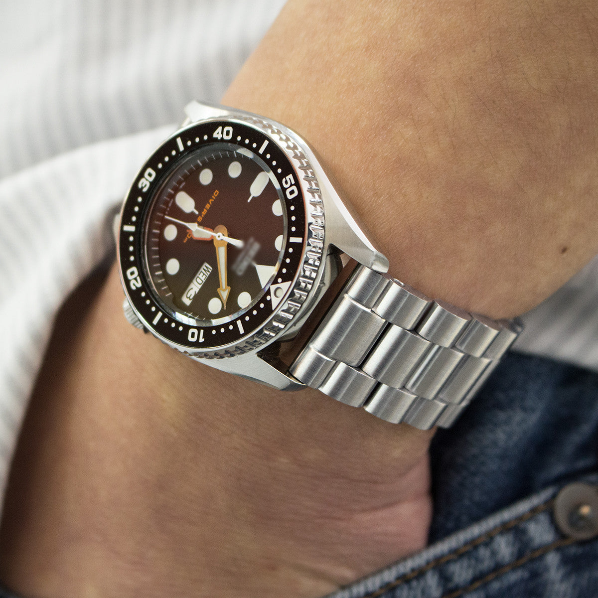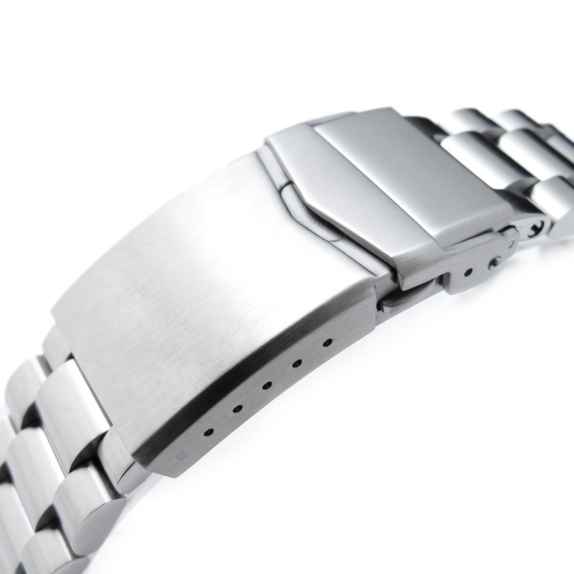 Endmill brushed solid 316L stainless steel watch bracelet is design for 20mm lug diver or sport watch case. Generic 2.5mm diameter Fat stainless steel spring bars included. All soild links including end links in half-moon shape are structured by screw fix adjustable details instead of common pins. Accompanied with 2015 new released V-Clasp double lock buttoned diver's clasp. V-Clasp was made from solid 316L stainless steel with extra 6 micro holes for flexible fine tune length adjustment. Featured in V shape safety lock, streamlined form & chamfer edged design to giving a more massive look. Chamfer double locks diver's buckle is ideal for watch band with thickness approximate 4.0 - 5.0mm. An awesome replacement watch bracelet tailor made for 20mm lug luxury watches.