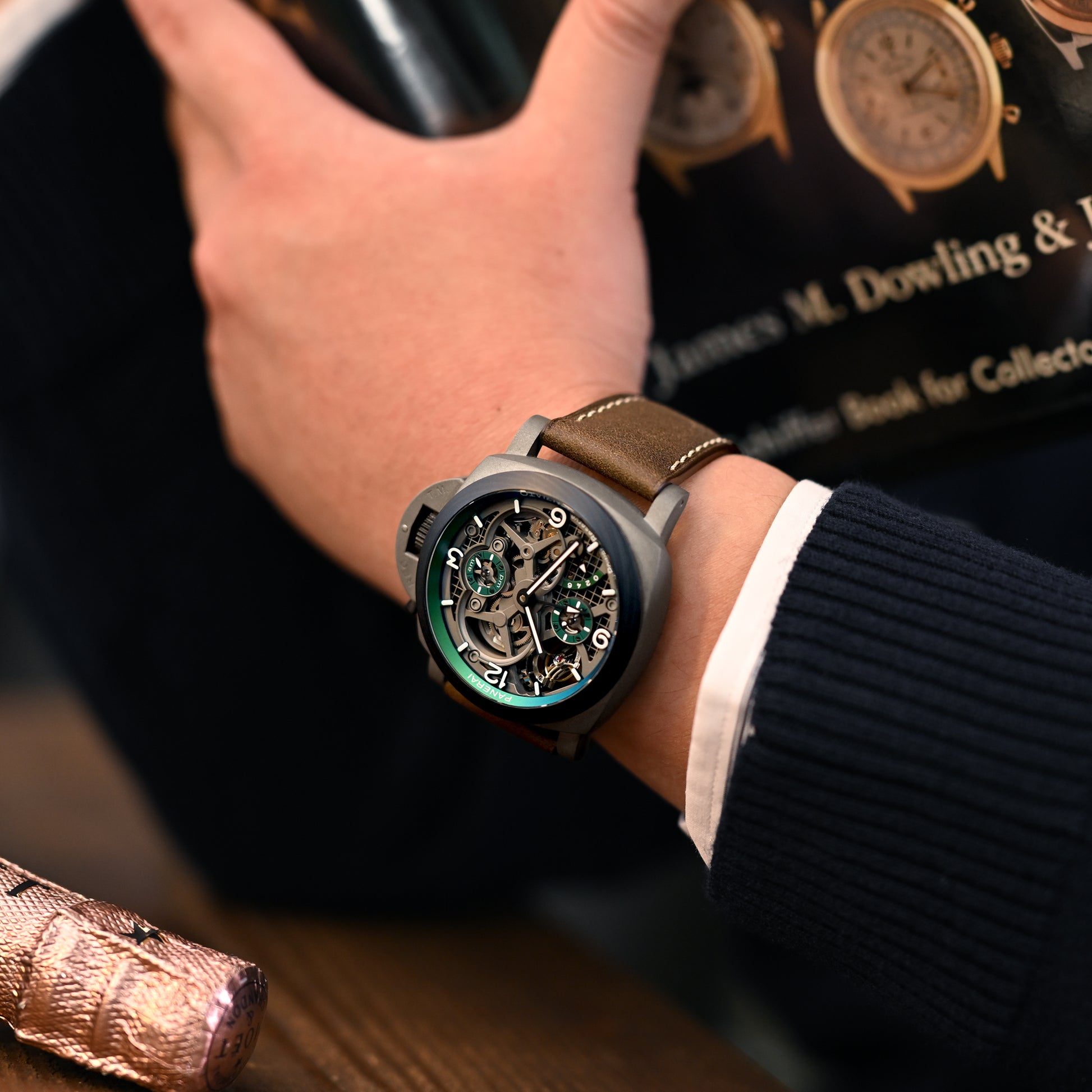 The prestigious Pam collection offers a strap crafted from only the finest of materials, featuring an Italian leather outer that showcases a supple grain blended with a luxurious French Barenia leather lining renowned for its exceptional softness, these select leathers undergo stringent conditioning to achieve an unparalled level of comfort and pliability on the wrist. Skillfull artisans shape the two leather into an elegant and long-lasting strap with 2mm holes that precisely fit Panerai pins for a flawless attachment to the watch and a 4mm tongue that seamlessly meets the buckle. Finally, delivering an enhanced wear experience when secured to a Panerai timepiece through distinguished sophistication that satisfies even the most discerning tastes as owners.