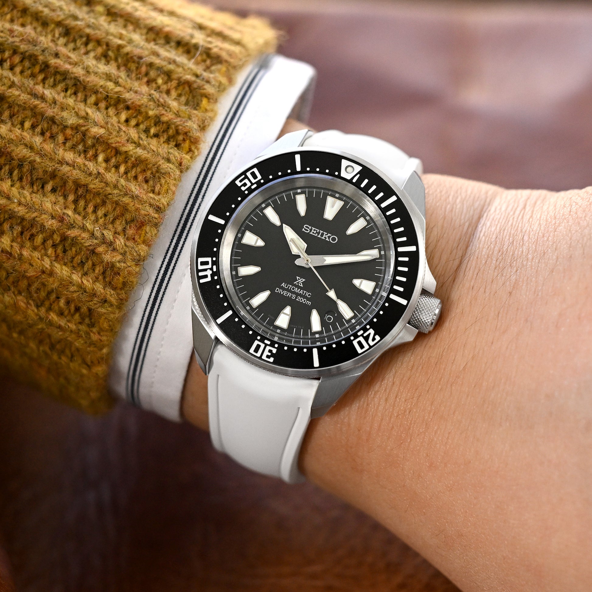 The FKM34 premium FKM rubber watch band features a tapered design that narrows from the lugs toward the clasp for a clean, contoured fit. Its semi-curved end eliminates the gap between the watch and strap, creating a flush connection for enhanced comfort and a more refined look. Two engraved lines run along both edges of its flat surface, adding refined detailing. Available in 20mm or 22mm sizes with five color options to suit your style. The 16mm or 18mm deployment clasp offers easy wear, while quick release pins enable effortless band swaps without tools. Adjust the length by trimming to your wrist size for a perfect fit. The FKM34 adapts to your daily routine - whether you're working out at the gym, attending meetings, running errands, or enjoying dinner with friends. Its tapered profile and engraved accents bring a polished touch to any watch, fitting naturally into every part of your day.